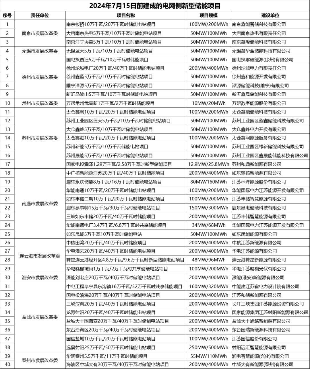 根據(jù)江蘇省2024年7月15日前建成的電網(wǎng)側新型儲能項目清單: