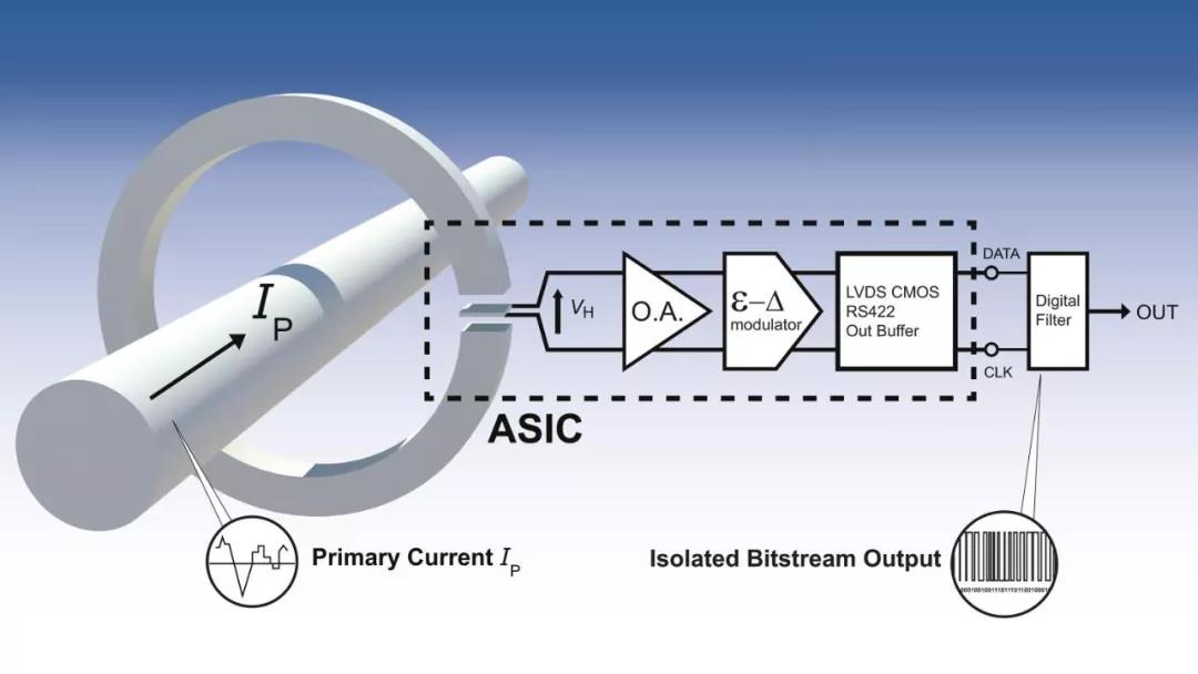 LEM公司針對(duì)數(shù)字化的市場(chǎng)需求,在經(jīng)典開(kāi)環(huán)傳感器的基礎(chǔ)上基于∑-△ ADC的技術(shù),開(kāi)發(fā)出了一系列的先進(jìn)數(shù)字輸出傳感器。其基本原理如圖1所示。
