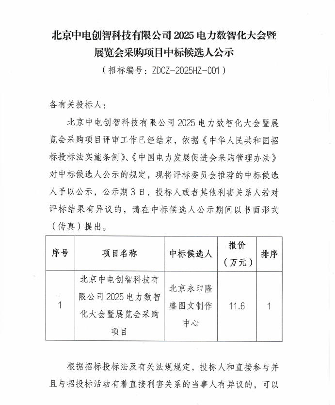 北京中電創(chuàng)智科技有限公司2025電力數(shù)智化大會暨展覽會采購項目中標(biāo)候選人公示