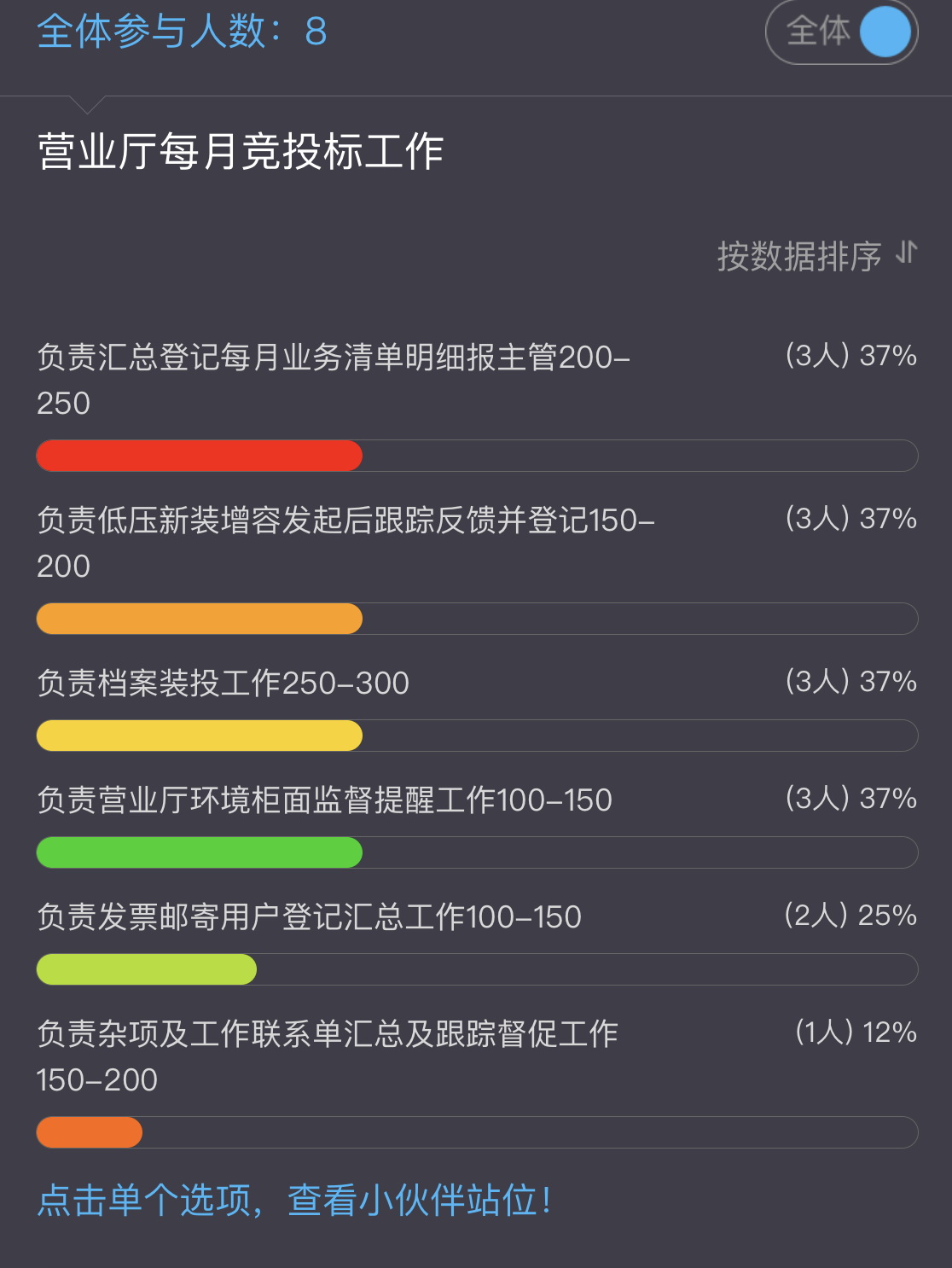 考慮分工的公平性和調(diào)動班組成員主動性,國網(wǎng)寧??h供電公司營業(yè)廳班組臨時發(fā)起一場“競標”。班長向大家宣布此次競標總分為200分,所有班組成員可以參與領(lǐng)取,競標方式采取線上報名,現(xiàn)場積極有序,未在現(xiàn)場的班組成員也可在手機小程序參與。3分鐘后有5人成功報名,其中張松以68分最低競標分競得該項任務(wù),在完成工作后,其當月的個人績效精益積分加68分。