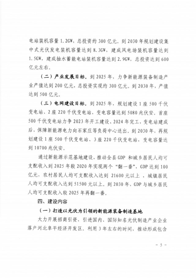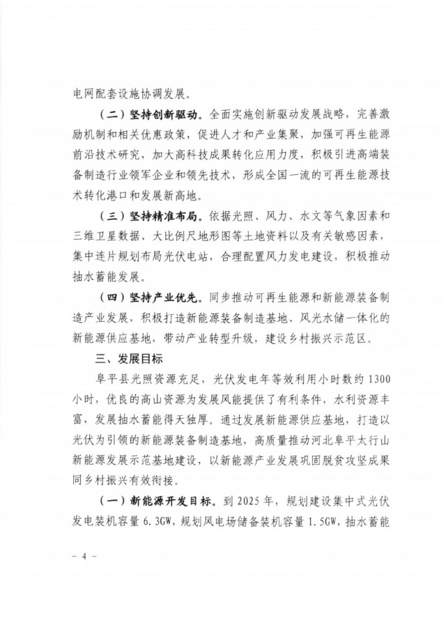 三、原則同意《河北阜平太行山新能源發(fā)展示范基地實施方案》提出的新能源開發(fā)目標(biāo),到2025年規(guī)劃建設(shè)集中式光伏6.3GW、風(fēng)電1.5GW、抽水蓄能1.2GW,2030年在此基礎(chǔ)上進(jìn)一步實現(xiàn)高質(zhì)量跨越式發(fā)展。