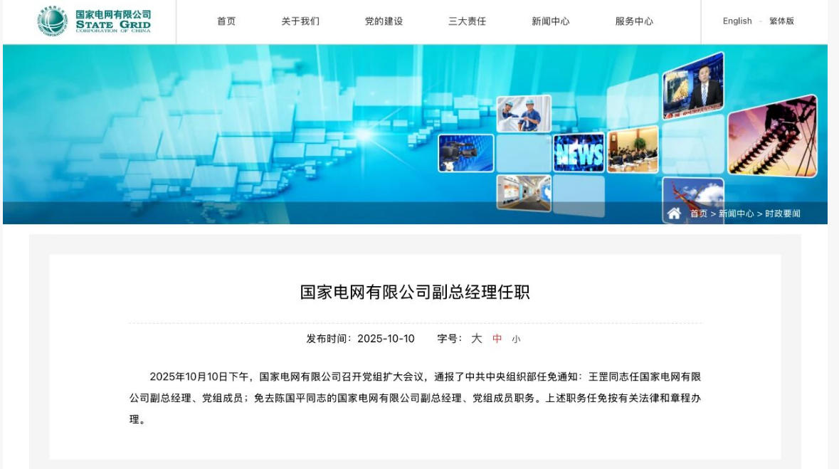 2025年10月10日下午,國家電網(wǎng)有限公司召開黨組擴(kuò)大會議,通報了中共中央組織部任免通知:
