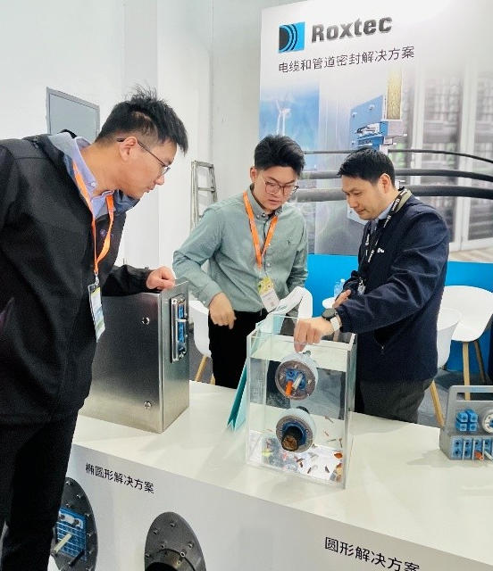大批風(fēng)電設(shè)備制造商、開發(fā)商及技術(shù)專家蒞臨參觀。國內(nèi)某風(fēng)電整機廠技術(shù)專家表示:“以往項目中,不同規(guī)格管線要匹配不同密封件,選型、庫存管理都很繁瑣,Roxtec多徑技術(shù)直接解決了這個痛點,對提升安裝效率很有幫助。”