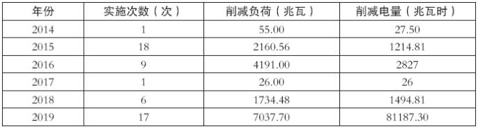 在需求響應(yīng)實施早期,實施目的主要是為了應(yīng)對夏季高峰時段電力消費緊張狀況,最大程度削減高峰電力負(fù)荷對電網(wǎng)安全的影響,保障了民生用電和重點用電安全平穩(wěn)。2014~2019年度國內(nèi)開展削峰需求響應(yīng)的情況如下表所示。