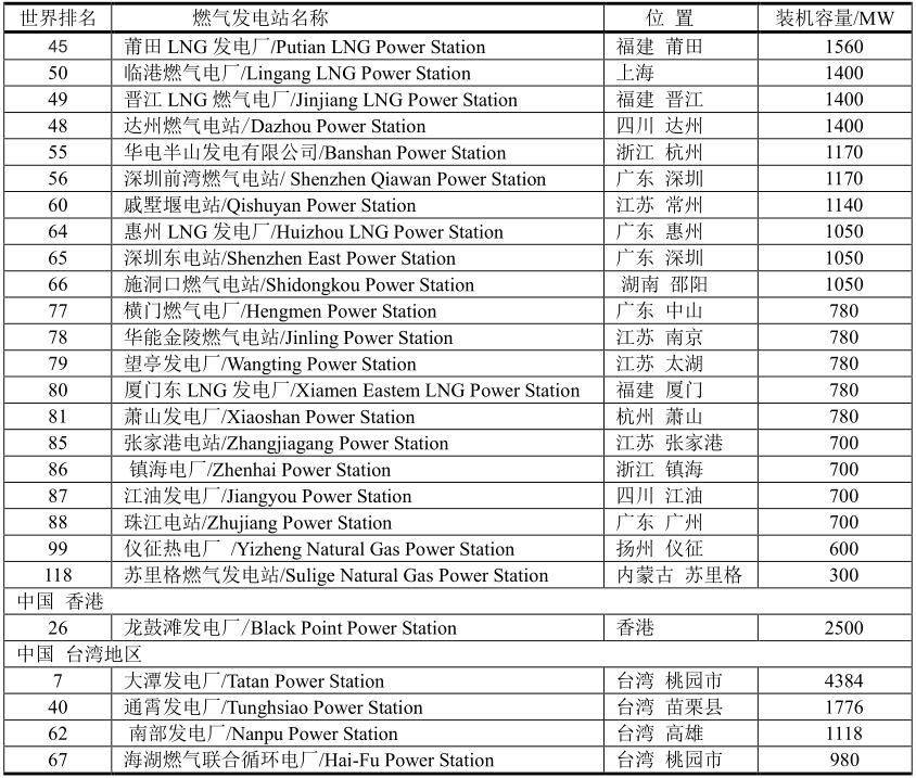 中國最大的燃?xì)獍l(fā)電站在中國臺(tái)灣地區(qū)—大潭發(fā)電廠(Tatan Power Station),其次是香港—龍鼓灘發(fā)電廠(Black Point Power Station)。