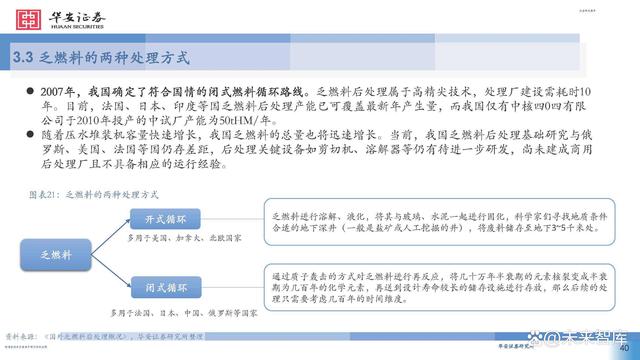 2007年,我國(guó)確定了符合國(guó)情的閉式燃料循環(huán)路線。乏燃料后處理屬于高精尖技術(shù),處理廠建設(shè)需耗時(shí)10 年。目前,法國(guó)、日本、印度等國(guó)乏燃料后處理產(chǎn)能已可覆蓋最新年產(chǎn)生量,而我國(guó)僅有中核四0四有限 公司于2010年投產(chǎn)的中試廠產(chǎn)能為50tHM/年。 隨著壓水堆裝機(jī)容量快速增長(zhǎng),我國(guó)乏燃料的總量也將迅速增長(zhǎng)。當(dāng)前,我國(guó)乏燃料后處理基礎(chǔ)研究與俄 羅斯、美國(guó)、法國(guó)等國(guó)仍存差距,后處理關(guān)鍵設(shè)備如剪切機(jī)、溶解器等仍有待進(jìn)一步研發(fā),尚未建成商用 后處理廠且不具備相應(yīng)的運(yùn)行經(jīng)驗(yàn)。