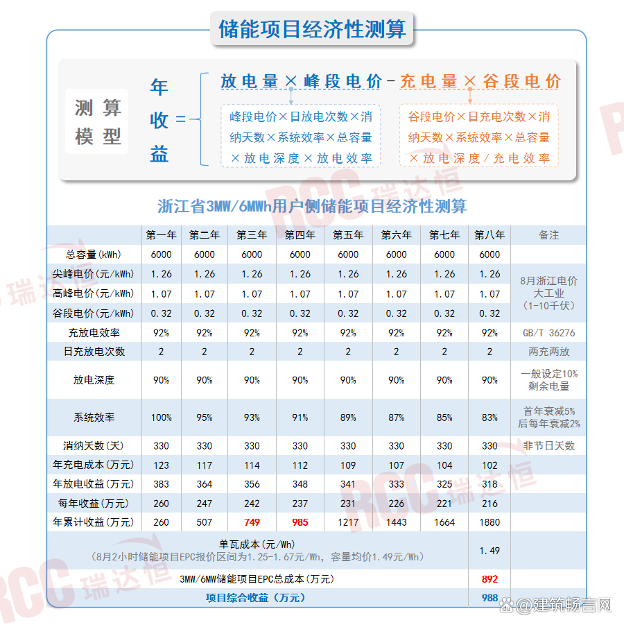 RCC瑞達(dá)恒研究院基于8月份的電價及儲能項目EPC中標(biāo)均價等數(shù)據(jù),以浙江省某化纖生產(chǎn)公司3MW/6MW的用戶側(cè)儲能項目為例進(jìn)行經(jīng)濟(jì)性測算得出:該項目約3.5年便可回收項目建設(shè)成本,按項目運行周期8年測算,項目可為業(yè)主節(jié)省988萬元的電費。