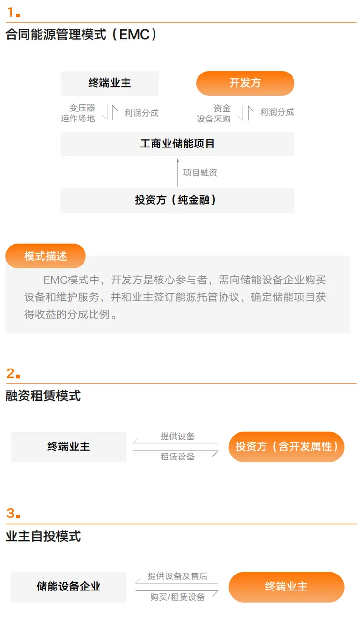 開(kāi)發(fā)模式也更加清晰。工商業(yè)儲(chǔ)能項(xiàng)目開(kāi)發(fā)模式有3種:合同能源管理模式(EMC)、融資租賃模式、業(yè)主自投模式。