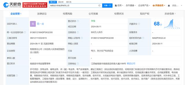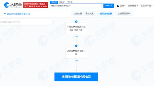 近日,南昌潤寧新能源有限公司成立,法定代表人為范一貞,注冊資本800萬人民幣,經(jīng)營范圍含工程和技術(shù)研究和試驗(yàn)發(fā)展、新興能源技術(shù)研發(fā)、在線能源計量技術(shù)研發(fā)、合同能源管理、電池銷售等。股權(quán)全景穿透圖顯示,該公司由時代綠色能源有限公司全資持股,后者為寧德時代(300750)全資子公司。
