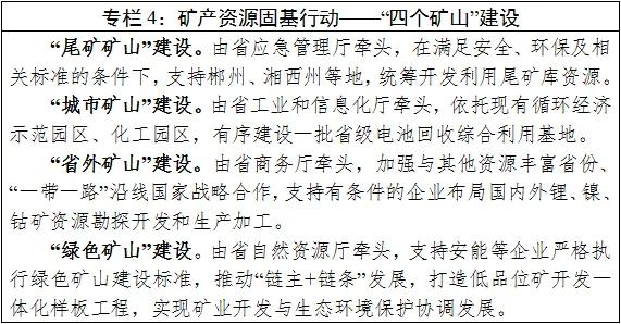 統(tǒng)籌開(kāi)展鋰電池及先進(jìn)儲(chǔ)能材料產(chǎn)業(yè)所需鋰、錳、鎳等主要礦產(chǎn)資源調(diào)查評(píng)價(jià)及勘查,加強(qiáng)新能源礦產(chǎn)資源儲(chǔ)備和統(tǒng)籌開(kāi)發(fā)利用。建設(shè)“尾礦礦山”,在滿足安全、環(huán)保及相關(guān)標(biāo)準(zhǔn)的條件下,支持開(kāi)發(fā)利用尾礦庫(kù)資源。建設(shè)“城市礦山”,依托現(xiàn)有循環(huán)經(jīng)濟(jì)示范園區(qū)、省級(jí)化工園區(qū),有序建設(shè)一批電池回收綜合利用示范基地。加強(qiáng)與其他資源豐富省份戰(zhàn)略合作,支持有條件的企業(yè)布局建設(shè)“省外礦山”,提升資源供應(yīng)保障能力。