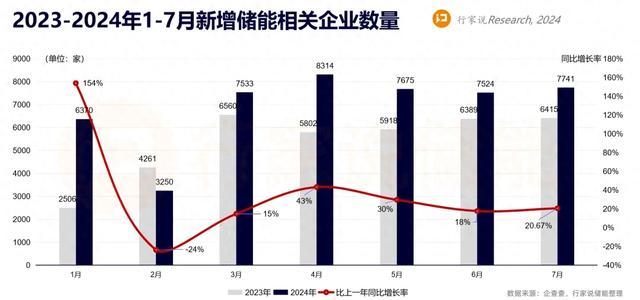 儲能設(shè)備相關(guān)企業(yè)中,4月新增量最多,達(dá)7174家,比去年同期增47.55%;5月、6月、7月新增量有所下滑,維持在6400-6600之間。與2023年同期相比,1月新增幅度最大,增速超1.5倍多。