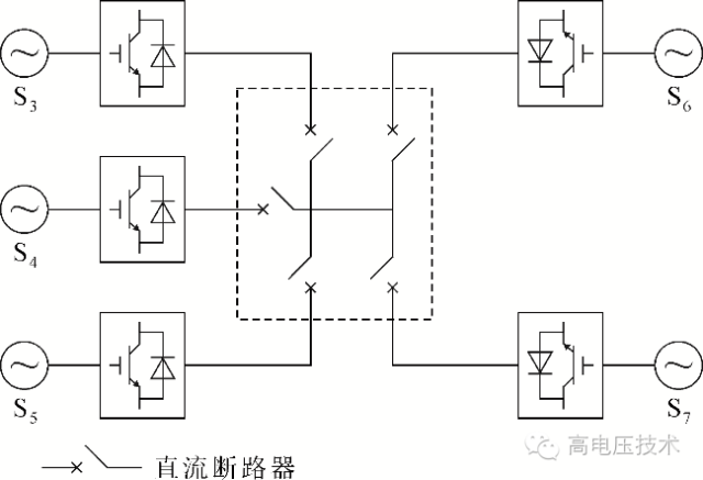 兩端VSC-HVDC系統(tǒng)拓?fù)浣Y(jié)構(gòu)較為簡單,通過點(diǎn)對(duì)點(diǎn)的連接實(shí)現(xiàn)有功功率的傳輸。在兩端基礎(chǔ)上發(fā)展而來的多端柔性直流輸電系統(tǒng)(VSC-MTDC),能夠?qū)崿F(xiàn)多電源供電和多落點(diǎn)受電,可以采用不同的拓?fù)浣Y(jié)構(gòu)形成直流網(wǎng)絡(luò),極大地提高了直流輸電系統(tǒng)的操作靈活性和系統(tǒng)的可靠性。多端直流系統(tǒng)的拓?fù)淇梢苑譃榇?lián)型和并聯(lián)型,如下圖1-圖4所示,其中并聯(lián)型包括星形拓?fù)洹h(huán)形拓?fù)浜托切?中央環(huán)形拓?fù)涞取?/p>