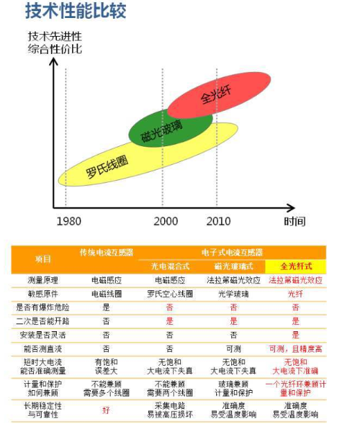 目前主流的電子式互感器主要有基于電磁感應(yīng)原理的羅氏線圈電流互感器(RCT)、基于法拉第磁旋光效應(yīng)的磁光玻璃電流互感器(OCT)和全光纖電流互感器(FOCT)。技術(shù)特點對比,詳見圖1。
