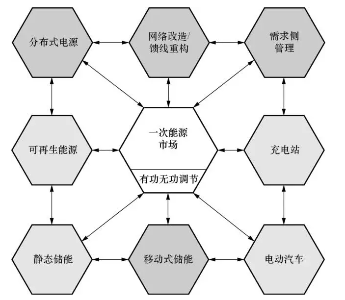 為了輔助智能電網(wǎng)規(guī)劃人員確保系統(tǒng)運(yùn)行的安全性,可靠性以及供電質(zhì)量,需要開(kāi)發(fā)綜合全面的新工具。文獻(xiàn)[16]通過(guò)對(duì)智能技術(shù)及其交互方式進(jìn)行分類(lèi),設(shè)計(jì)了一個(gè)專(zhuān)為智能電網(wǎng)規(guī)劃人員量身定做的工具箱架構(gòu)(如圖5所示)。規(guī)劃人員在確定電網(wǎng)建設(shè)和饋線重構(gòu)方案時(shí),并非像傳統(tǒng)做法那樣只考慮峰荷,而是同時(shí)考慮分布式電源(DG)、移動(dòng)式存儲(chǔ)和需求側(cè)管理(DSM),這樣得到的方案更具成本效益。通過(guò)可再生能源和靜態(tài)儲(chǔ)能相互配合可以削峰填谷,增加網(wǎng)絡(luò)容量;充電站的電動(dòng)汽車(chē)耗電量受實(shí)時(shí)電價(jià)變化的影響,因此可作為DSM的一部分;各類(lèi)儲(chǔ)能設(shè)備可被用來(lái)提升電能質(zhì)量,因此可被視為有功/無(wú)功功率源;一次能源市場(chǎng)運(yùn)行人員在擁有發(fā)電和儲(chǔ)能資源的輸配電運(yùn)行人員之間進(jìn)行協(xié)調(diào)優(yōu)化,得到實(shí)時(shí)電價(jià),通過(guò)AMI提供給用戶。此工具箱的理念和結(jié)構(gòu)尚未成熟,還需在未來(lái)的研究工作中進(jìn)一步完善。