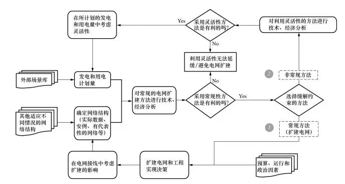 目前,法國(guó)配電公司(ERDF)正在研究如何利用發(fā)電側(cè)和需求側(cè)的靈活性來(lái)緩解電壓、線路傳輸容量的限制,從而避免/延緩電網(wǎng)擴(kuò)建的問(wèn)題,文獻(xiàn)[13]就此給出了一個(gè)通用框架(如圖4所示),對(duì)常規(guī)的電網(wǎng)擴(kuò)建方法和利用電網(wǎng)靈活性的方法進(jìn)行技術(shù)、經(jīng)濟(jì)比較,選擇成本效益最高的作為最終方案。發(fā)電、用電資源的靈活性是從容量、持續(xù)時(shí)間和頻率等幾方面來(lái)定義的,而這不僅需要負(fù)荷持續(xù)時(shí)間曲線,還需要隨機(jī)時(shí)序負(fù)荷曲線,其預(yù)測(cè)方法也是ERDF目前正致力于研究的一個(gè)領(lǐng)域。在進(jìn)行技術(shù)、經(jīng)濟(jì)比較時(shí),主要是比較采用某方案所需要的成本和該方案能夠減少電量不足期望值(ExpectedEnergyNotSupplied,EENS)所帶來(lái)的收益,如果前者小于后者,則該方案是具有成本效益的。另外,文獻(xiàn)[13]認(rèn)為,雖然在有些情況下利用電網(wǎng)靈活性可能很難達(dá)到電網(wǎng)擴(kuò)建后高可靠、高質(zhì)量的供電,但是如果能夠獲得較好的成本效益,利用電網(wǎng)靈活性來(lái)推遲電網(wǎng)擴(kuò)建也是合理的。