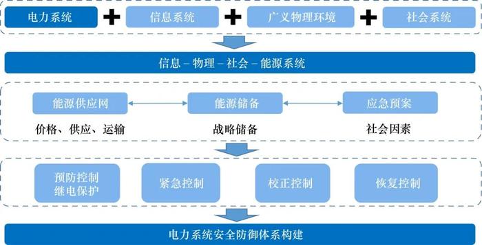 在信息物理社會系統(tǒng)框架方面,采用機理分析和沙盤推演手段,開展極端事件、綜合能源、政策機制、規(guī)劃運行的“時 ? 空 ? 物”要素分析;研究不確定性因素對能源 ? 電力可靠性及經(jīng)濟性的影響規(guī)律,構(gòu)建覆蓋電力系統(tǒng)運行過程,具有多類目標(biāo)、多道防線能力的電力安全主動防御體系。