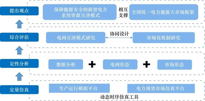 在資源配置模式方面,采取定量仿真、定性分析、綜合評估等方式,根據(jù)生產(chǎn)運行模擬平臺、電力現(xiàn)貨市場仿真平臺的結(jié)果,融合電網(wǎng)形態(tài)及市場形態(tài)數(shù)據(jù)分析,論證形成新型能源體系下電網(wǎng)互濟模式及相應(yīng)的市場支撐機制,從而構(gòu)建新型電力系統(tǒng)資源互濟模式、全國統(tǒng)一電力能源大市場框架相互支撐的大范圍共享互濟體系。