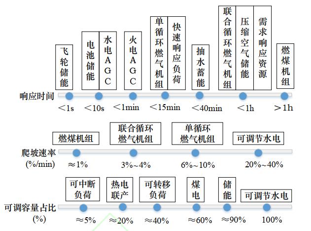 一方面要挖掘不同環(huán)節(jié)的靈活性資源參與系統(tǒng)調(diào)節(jié);另一方面要完善市場(chǎng)機(jī)制,給予資源一定的激勵(lì)與補(bǔ)償。電力市場(chǎng)輔助服務(wù)作為提升電力系統(tǒng)靈活性的手段之一,主要包括一次調(diào)頻、自動(dòng)發(fā)電控制、調(diào)峰、無(wú)功調(diào)節(jié)、備用、黑啟動(dòng)等。