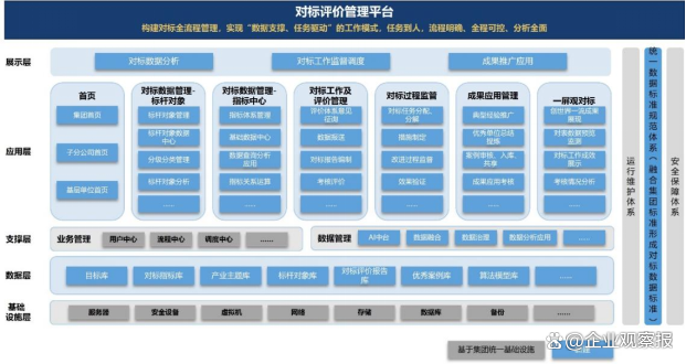 “一個平臺”,即面向集團公司的領(lǐng)導(dǎo)、集團部門、子分公司、基層單位等多類用戶,建立“建標、立標、對標、達標、創(chuàng)標”對標規(guī)范化閉環(huán)管理的,集團統(tǒng)一、自主可控的數(shù)智化對標管理平臺,確保集團“對標評價管理”的可持續(xù)性和動態(tài)性,提高集團對標工作數(shù)字化、智能化水平,提高集團和各級公司信息的共享度和透明度。