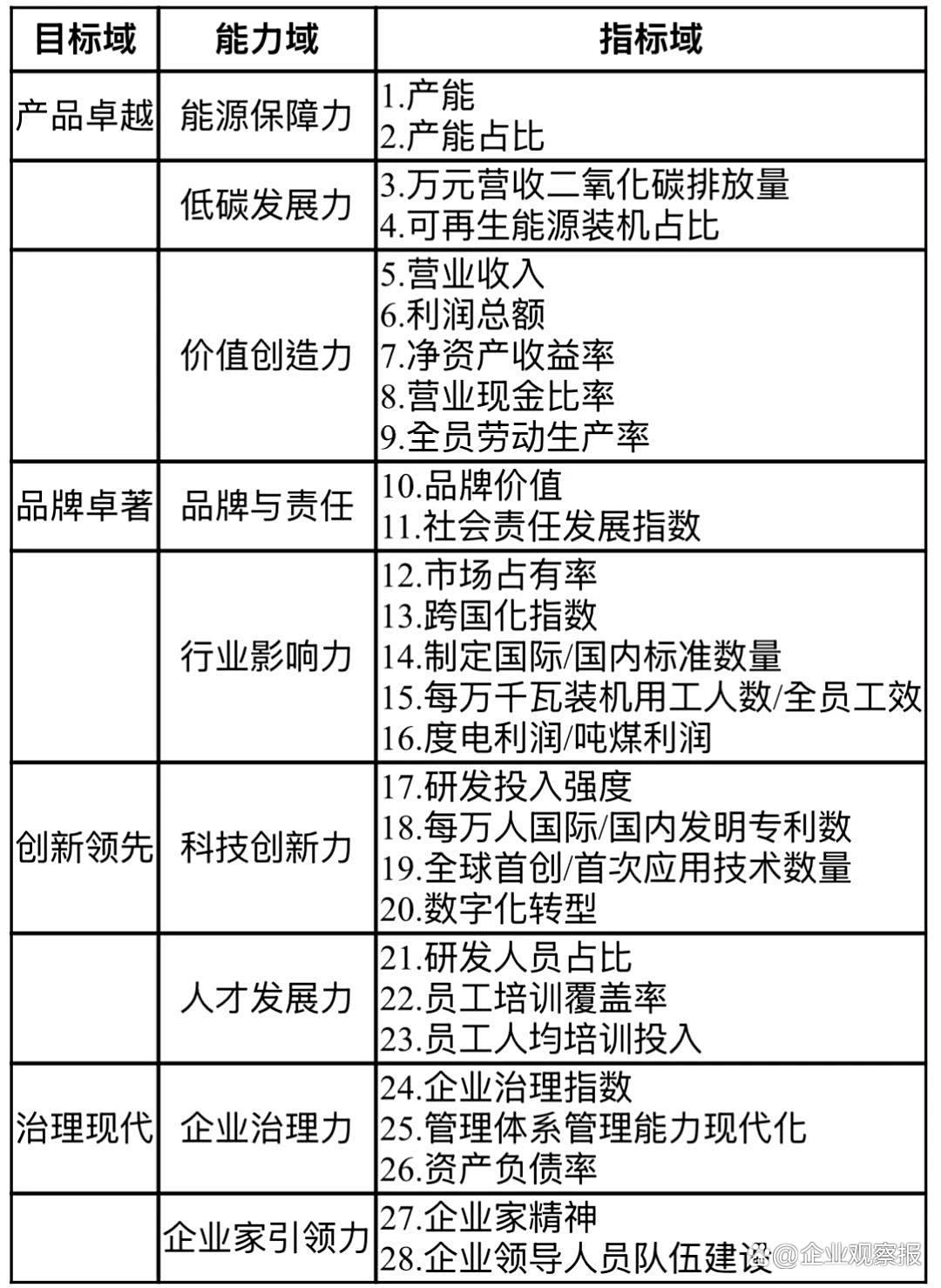 在構(gòu)建了目標域與能力域的關(guān)系基礎(chǔ)上,以產(chǎn)品卓越、品牌卓著、創(chuàng)新領(lǐng)先、治理現(xiàn)代為目標,由每項關(guān)鍵能力延伸出具體指標,從而形成三級結(jié)構(gòu)的世界一流能源電力企業(yè)對標指標體系,見表1。指標體系共包含28項具體指標:第一級包含4個維度,分別是產(chǎn)品卓越、品牌卓著、創(chuàng)新領(lǐng)先、治理現(xiàn)代;第二級是以第一級指標為目標、結(jié)合能源電力企業(yè)經(jīng)營發(fā)展的特征及趨勢而確定的8項關(guān)鍵成功要素,分別是產(chǎn)品保障力、價值創(chuàng)造力、品牌與責(zé)任、行業(yè)影響力、科技創(chuàng)新力、商業(yè)創(chuàng)新力、治理力以及企業(yè)家引領(lǐng)力;第三級是第二級指標延伸的28項指標,涵蓋了國務(wù)院國資委關(guān)于世界一流企業(yè)的評價指標和中央企業(yè)的年度考核指標,反映了企業(yè)包含科技創(chuàng)新、行業(yè)引領(lǐng)和社會責(zé)任等方面的綜合實力和水平。