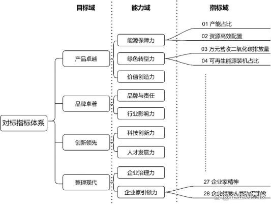 “一個體系”,即構(gòu)建業(yè)績維度和管理要素并重的,滿足全集團統(tǒng)一、多級貫通的世界一流企業(yè)對標指標體系。對標指標體系重點體現(xiàn)“產(chǎn)品卓越、品牌卓著、創(chuàng)新領(lǐng)先、治理現(xiàn)代”十六字標準和“創(chuàng)新力、競爭力、治理力、影響力、引領(lǐng)力”五力要求,結(jié)合集團未來發(fā)展方向、定位和目標等進行選擇和設(shè)置,通過分級分類建立集團各級子公司的對標指標體系,形成涵蓋集團公司綜合對比指標體系及子分公司等若干產(chǎn)業(yè)特色共性指標,實現(xiàn)傳導(dǎo)壓力、激發(fā)動力,進而增強創(chuàng)建世界一流企業(yè)行動的系統(tǒng)性、針對性和有效性。