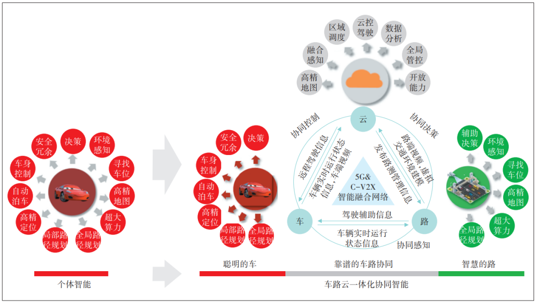 隨著車輛智能化水平的不斷提高,車載計(jì)算設(shè)備的算力逐漸難以滿足復(fù)雜路況下實(shí)時(shí)處理大量數(shù)據(jù)的需求,既是成本瓶頸,也是能力瓶頸。為解決這一問題,行業(yè)研究出車路云一體化的技術(shù)演進(jìn)路線(見圖5)。此方案體系下,車輛通過高速穩(wěn)定的通信網(wǎng)絡(luò)與云端服務(wù)器、道路感知設(shè)備進(jìn)行實(shí)時(shí)數(shù)據(jù)交互。云端強(qiáng)大的計(jì)算能力既可對(duì)車輛上傳的大量傳感器數(shù)據(jù)進(jìn)行快速處理和分析,也可處理道路感知設(shè)備上報(bào)的實(shí)時(shí)道路信息和交通狀況。平臺(tái)綜合分析后將決策指令及時(shí)反饋給車輛,從而輔助車輛做出更精準(zhǔn)的決策。車路云一體化的技術(shù)方案可有效彌補(bǔ)車輛自身算力不足,進(jìn)一步提升智能網(wǎng)聯(lián)車輛的運(yùn)行效率和安全性,并為降低智能駕駛成本推動(dòng)智能網(wǎng)聯(lián)汽車快速普及,助力智能交通發(fā)展提供堅(jiān)實(shí)基礎(chǔ)。