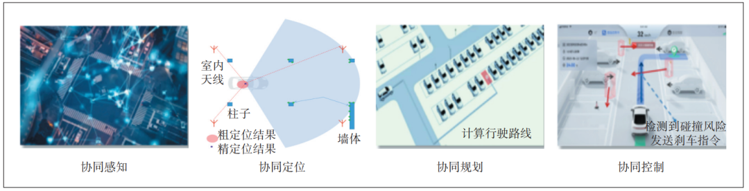 典型場景如智慧泊車,通過協(xié)同感知、協(xié)同定位、協(xié)同規(guī)劃和協(xié)同控制等技術(shù)實(shí)現(xiàn)高效、智能的停車管理和服務(wù)(見圖1)。智慧泊車的技術(shù)核心是根據(jù)多源傳感器異構(gòu)算法聯(lián)合感知的異步動(dòng)態(tài)協(xié)同感知系統(tǒng),基于場側(cè)的無線通信技術(shù)和車輛即時(shí)定位與地圖構(gòu)建技術(shù)的協(xié)同定位系統(tǒng),同時(shí)基于先驗(yàn)地圖和實(shí)時(shí)路況的全局路徑調(diào)度和車輛感知的局部軌跡規(guī)劃的協(xié)同系統(tǒng),以及場端原始感知數(shù)據(jù)及預(yù)測與車輛實(shí)時(shí)規(guī)劃軌跡的實(shí)時(shí)干涉控制系統(tǒng),實(shí)現(xiàn)車路云一體化的泊車服務(wù)。
