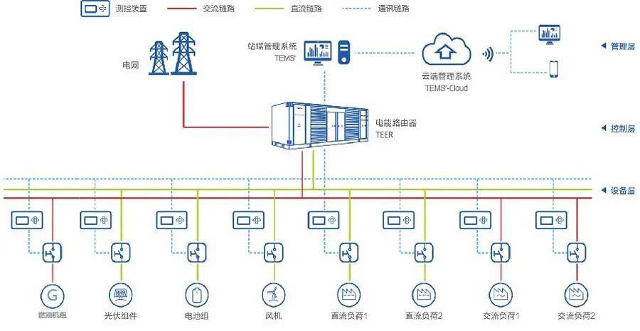 基于電力電子變壓器的交直流混合微網(wǎng)系統(tǒng)總體可分為三層架構(gòu)。第一層為設(shè)備層,主要囊括了分布式電源(風電、光伏系統(tǒng)等)和不同的交直流負荷;第二層控制層,以電力電子變壓器為核心,分布式電源和負荷可通過其靈活的多端口配置實現(xiàn)可靠接入,并通過其中/高壓接口,實現(xiàn)與配電網(wǎng)的有效連接;第三層為管理層,以“雙端”能量管理系統(tǒng)為核心,采用人工智能算法可實現(xiàn)電力電子變壓器交直流混合系統(tǒng)的分布式能源互補優(yōu)化以及多個端口之間的協(xié)調(diào)控制,提高能源利用效率,多機并聯(lián)系統(tǒng)的集群控制、功率在線優(yōu)化分配,保障系統(tǒng)效率最優(yōu),同時能夠?qū)与娋W(wǎng)調(diào)度,參與電力市場交易及輔助服務(wù)等,真正實現(xiàn)綠色數(shù)據(jù)中心電能的智能路由。