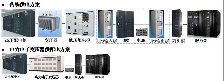 數(shù)據(jù)中心傳統(tǒng)的UPS供電方案,是由高壓配電柜、變壓器、低壓配電柜、UPS等組成,雖然系統(tǒng)方案成熟,但由于設(shè)備種類數(shù)量多,電能變換環(huán)節(jié)多,占地面積大,轉(zhuǎn)換效率低,已有被逐步淘汰的趨勢。