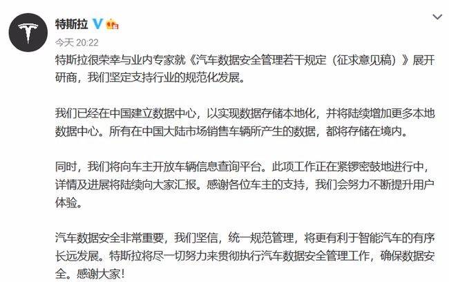 5月25日,特斯拉宣布已經(jīng)在中國(guó)建立了數(shù)據(jù)中心,將實(shí)現(xiàn)數(shù)據(jù)存儲(chǔ)本地化,并將陸續(xù)增加更多本地?cái)?shù)據(jù)中心。所有在國(guó)內(nèi)市場(chǎng)銷(xiāo)售的車(chē)輛所產(chǎn)生的數(shù)據(jù)都將存儲(chǔ)在境內(nèi)。