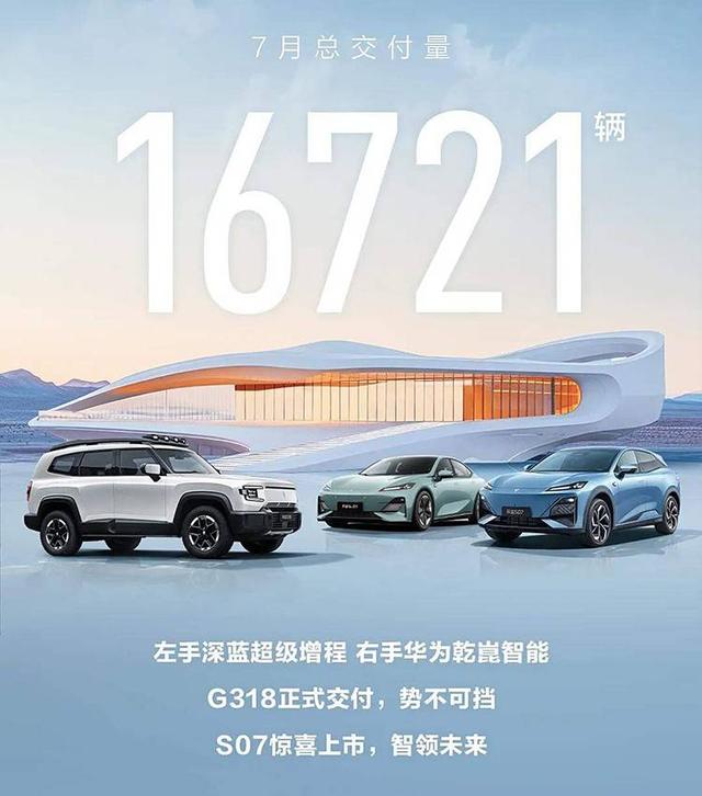 藍(lán)汽車官方宣布,7月累計共交付16721輛。在7月份,深藍(lán)G318正式開啟交付。深藍(lán)S07也迎來上市,該車共推出10款車型,售價區(qū)間為14.99-21.29萬元。