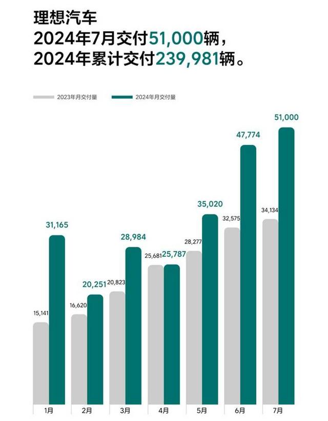 理想汽車在7月交付新車51000輛,創(chuàng)月交付量的歷史新高,同比增長49.4%。今年1-7月,理想共計交付239981輛。截至2024年7月31日,理想汽車?yán)塾嫿桓?73345輛。