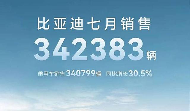 比亞迪官方公布其7月乘用車銷售340799輛,同比增長30.5%,純電車型銷量達130,000輛,插混車型210,799輛。1-7月,比亞迪乘用車?yán)塾嬩N售1,947,944輛,同比增長29.07%。