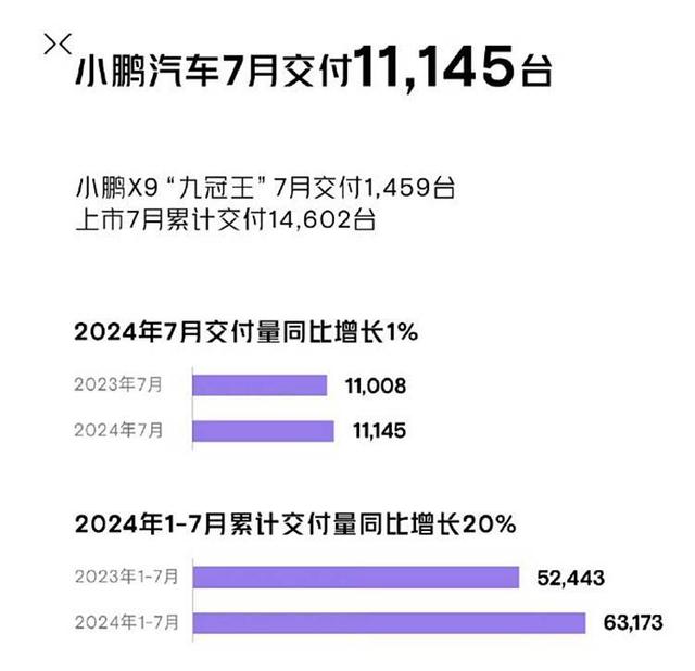 7月小鵬汽車共交付新車11,145臺,同比增長1%,環(huán)比增長4%。1月-7月,小鵬汽車?yán)塾嫿桓缎萝嚬?3,173臺,同比增長20%。