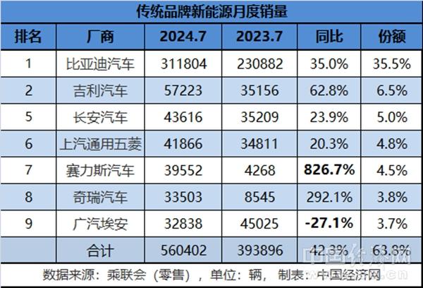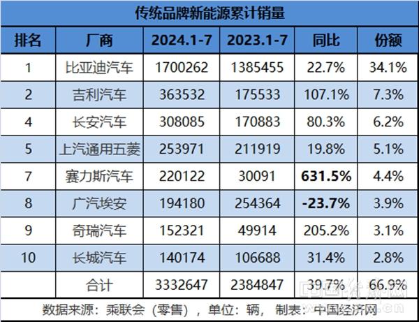 從前7個(gè)月的累計(jì)銷(xiāo)量來(lái)看,傳統(tǒng)新能源車(chē)企還是維持原有格局,入圍前十榜單的8家品牌的合計(jì)銷(xiāo)量超過(guò)333萬(wàn)輛,同比增長(zhǎng)39.7%,在新能源乘用車(chē)總銷(xiāo)量中的占比近七成。