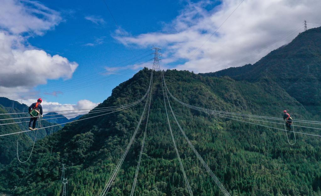 10月18日,在四川省雅安市天全縣喇叭河鎮(zhèn),技術人員在導線上進行質檢工作(無人機照片)。新華社記者 王曦 攝