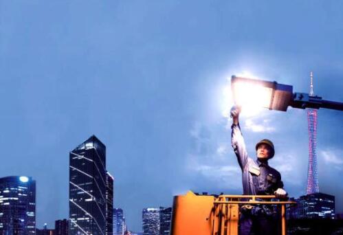 圖為廣州供電局運(yùn)維人員正在高空作業(yè)車上將傳統(tǒng)路燈更換為LED節(jié)能燈。