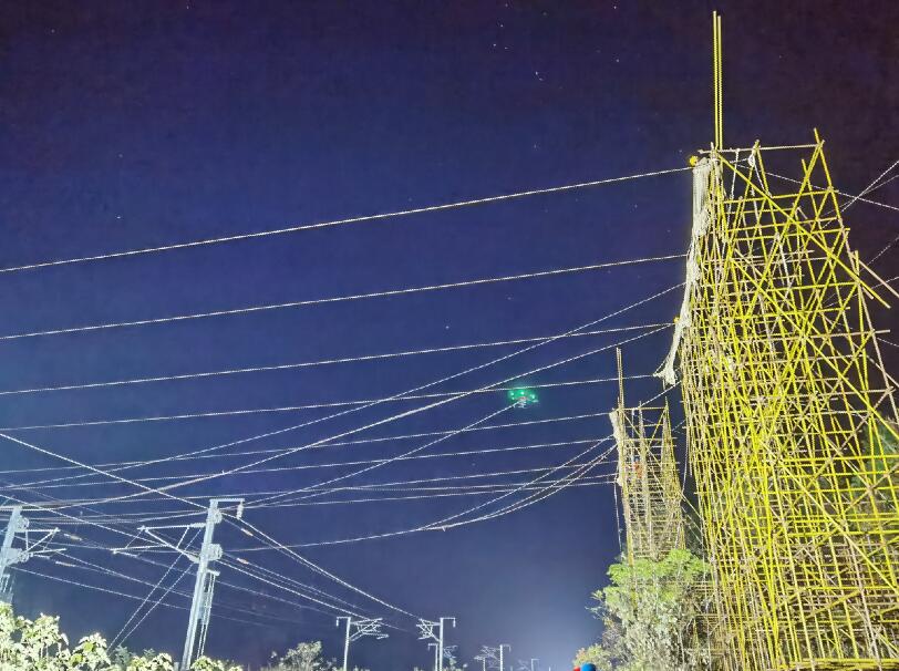 當(dāng)晚0時(shí)0分,六旋翼無(wú)人機(jī)從武西高鐵南側(cè)起飛,牽引著迪尼瑪繩向北側(cè)飛去,地面作業(yè)人員順著無(wú)人機(jī)的牽拉力量緩緩放繩。鐵路軌道處監(jiān)護(hù)人員密切觀測(cè)著各級(jí)引繩與跨越架之間的距離,通過(guò)對(duì)講機(jī)通知牽張場(chǎng)及時(shí)調(diào)整牽張力,確保架線施工順利進(jìn)行。
