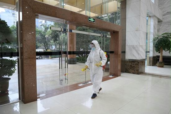 國網(wǎng)重慶北碚供電公司后勤人員對辦公大樓進(jìn)行殺菌消毒