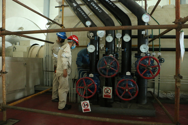 攻堅克難,保機組穩(wěn)定運行。大鵬之動,非一羽之輕也;騏驥之速,非一足之力也。盛夏的廠房內(nèi)異常悶熱,機組設(shè)備發(fā)出來的熱量讓人喘不過氣來,就在這種條件下,該廠干部職工為了快速消除缺陷,不懼困難,連續(xù)奮戰(zhàn)在現(xiàn)場。總工程師叮囑大家注意安全,輪換休息,防止中暑,并協(xié)調(diào)解決工器具及材料,查看作業(yè)環(huán)境,檢查安全措施;設(shè)備部積極與哈爾濱電機廠取得聯(lián)系,請專業(yè)人員入廠探討解決方法,同時編制安全技術(shù)組織措施方案,解決設(shè)備作業(yè)過程中遇到的技術(shù)性問題,對設(shè)備作業(yè)過程中出現(xiàn)的質(zhì)量問題提出整改意見;安監(jiān)部強化監(jiān)督,從兩票控制措施執(zhí)行、腳手架及現(xiàn)場防爆行燈漏電保護器的使用情況到確認(rèn)施工現(xiàn)場氫氣含量等無死角的全程檢查盯守,為消缺工作保駕護航;發(fā)電部運行人員全力配合,嚴(yán)格按照工作票所列危險點布置安全措施,開關(guān)閥門,在檢修期間密切監(jiān)視發(fā)電機風(fēng)溫,發(fā)現(xiàn)問題及時對參數(shù)進行調(diào)整,在保證機組安全運行的基礎(chǔ)上,為消缺工作創(chuàng)造便利條件;電氣車間電機班人員分解氫冷器冷卻水出、入口法蘭短接及彎頭,在氫冷器冷卻水入口法蘭處加裝堵板,把配制好的藥液從氫冷器冷卻水出口彎頭處注滿氫冷器。工作中大家分工明確,忙而不亂,盡管現(xiàn)場氣溫高,卻沒有阻擋大家的干勁。