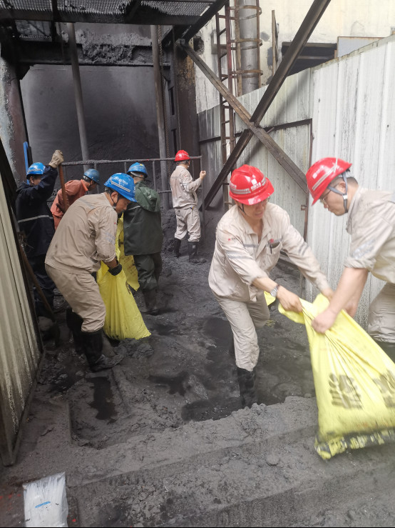 上午10時,暴雨加劇,主機集控室開始大量漏水,吊頂部分塌落,下方的電子設(shè)備間漏水嚴重,部分參數(shù)失真;汽機房外的廠內(nèi)主路積水達50公分;煤溝進水;廠前區(qū)全部停電、大門外波濤洶涌;墻外從山上下來的山洪更是濁浪排空。危急關(guān)頭,首陽山項目部20余名黨員干部職工積極參與防汛行動,用沙袋堵塞缺口,加固堤壩,險情逐漸消除。17時,首陽山發(fā)電公司運煤通道路基塌方,燃煤運輸中斷。險情就是命令!面對只有兩天用量的煤炭庫存,項目部人員積極參與到首陽山發(fā)電公司抗洪搶險隊伍中,共筑防汛抗洪“同心堤”。經(jīng)過連續(xù)八個小時團結(jié)奮戰(zhàn),燃煤供應(yīng)線路逐步恢復,大唐人抵抗住了偃師幾十年罕見的暴雨襲擊,為地方抗洪搶險、保障城市安全電力貢獻了力量。
