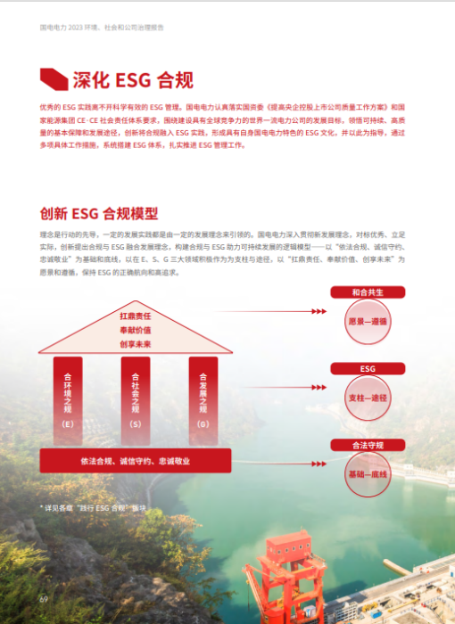 國電電力積極探索以質(zhì)量為支撐、誠信為基石、社會責(zé)任為核心、品牌為名片的“四位一體”建設(shè)路徑,創(chuàng)新提出ESG合規(guī)融合發(fā)展理念,精心打造“1+N”ESG報告體系,運用ESG治理思維指導(dǎo)業(yè)務(wù)工作,找準(zhǔn)生產(chǎn)、經(jīng)營和管理與ESG體系建設(shè)的融合點,為高質(zhì)量推進ESG治理打下基礎(chǔ),助力加快建設(shè)具有全球競爭力的世界一流電力公司。