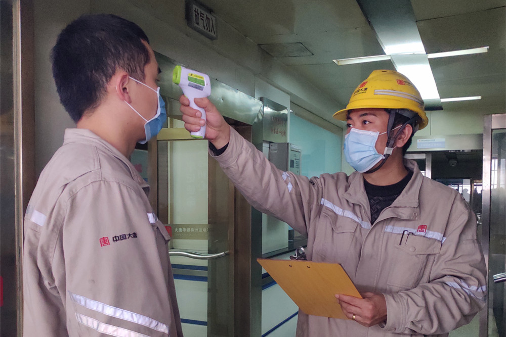 檢測體溫 方劍學(xué)是大唐華銀株洲發(fā)電公司發(fā)電部的一名集控運行主操,每天他上班都要經(jīng)過兩次體溫測量和佩戴口罩檢查。在疫情發(fā)生的第一時間,該公司迅速落實戰(zhàn)“疫”保電工作要求,實行生產(chǎn)區(qū)崗哨、集控室準(zhǔn)入制,凡是進(jìn)入公司區(qū)域的人員必須先接受檢查,做到外防輸入、內(nèi)防傳播,確保職工生命安全和機組發(fā)電安全。