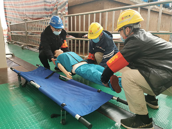 此次演練在主安裝廠2號(hào)機(jī)組大修現(xiàn)場(chǎng)進(jìn)行,模擬兩名施工人員在轉(zhuǎn)輪支架3米多高的平臺(tái)上焊接縫隙,一名工作人員未系安全帶進(jìn)行作業(yè),不慎摔倒墜落。該公司相關(guān)部門接到報(bào)告后,迅速啟動(dòng)應(yīng)急機(jī)制,立即撥打120緊急電話,并通知應(yīng)急救援隊(duì)趕赴事故現(xiàn)場(chǎng)。救援現(xiàn)場(chǎng),應(yīng)急隊(duì)員迅速判斷危險(xiǎn)情況,并檢查傷員傷勢(shì),大家齊心協(xié)力將傷員轉(zhuǎn)移到安全地帶,拉起警戒線,對(duì)傷員進(jìn)行緊急檢查。救援人員發(fā)現(xiàn)傷者腿部骨折,無法行動(dòng),立即進(jìn)行骨折包扎急救,按部就班、細(xì)致謹(jǐn)慎對(duì)傷口進(jìn)行消毒、止血、固定、包扎。最后,傷員被順利送往醫(yī)院。