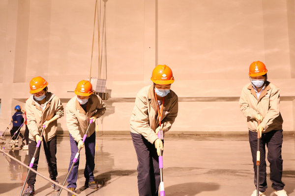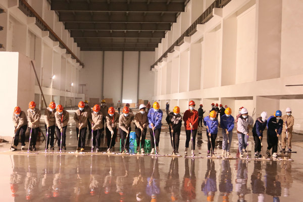 在到達位于汽機房17米平臺的GIS室后,女職工明確分工,協(xié)同配合,裝水、噴水、清掃、沖水、拖地……分區(qū)域、分小組地對GIS室地面進行清潔。當大家看著地面從塵土漫漫逐漸變成干凈整潔的地面,干凈的面龐已是塵土夾雜著汗水,臉上的笑容依舊如初,勞動的成就感,為工程建設作出力所能及貢獻的自豪感充溢著大家的內心。經過兩個多小時的勞動,順利完成了600平方米GIS室地面的清潔。