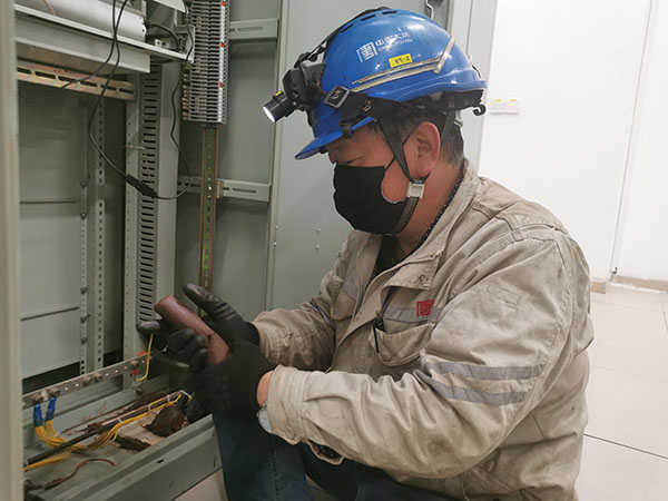 一線職工進(jìn)行故障錄波器配電柜防火封堵