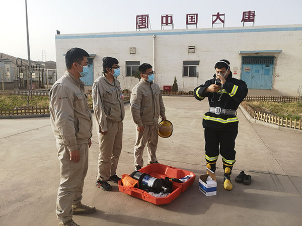 首先開展的是干粉滅火器實(shí)操演練。運(yùn)維人員取出4具即將送檢的滅火器,用小推車裝好干柴放置在空曠地點(diǎn),駐站人員講解了滅火器檢查方法和使用流程后,在確保安全的情況下將小推車內(nèi)的干柴點(diǎn)燃。一名工作人員用滅火器將車內(nèi)的火焰撲滅,再重新點(diǎn)燃,下一名人員繼續(xù)操作,最終達(dá)到參訓(xùn)人員全部能夠熟練使用滅火器的目的;其次,開展正壓呼吸器使用實(shí)操演練。在每個(gè)人都熟練掌握說明書上使用步驟和注意事項(xiàng)后,每名工作人員都穿戴正壓呼吸器一次,如果穿戴流程錯(cuò)誤立即糾正并重新穿戴;再次,開展消防戰(zhàn)斗服穿戴實(shí)操演練。有火電消防工作經(jīng)驗(yàn)的人員對戰(zhàn)斗服使用步驟進(jìn)行詳細(xì)講解,每名工作人員都穿戴消防戰(zhàn)斗服一次,達(dá)到全員均能熟練穿戴的目的;最后,所有參訓(xùn)人員都組裝并佩戴防毒面具一次。