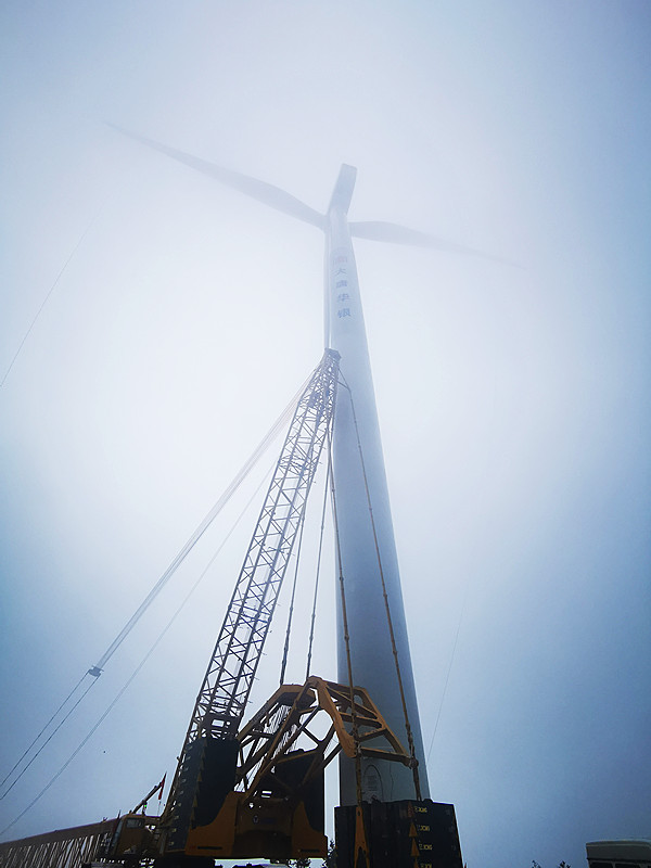 該項(xiàng)目自2021年8月2日全面開工建設(shè)以來,全員克服時(shí)間緊、任務(wù)重,以及夏季長(zhǎng)時(shí)間高溫、近期溫度驟降、山上風(fēng)力較大等重重困難,縝密部署,團(tuán)結(jié)拼搏,以扎實(shí)的管理、良好的協(xié)調(diào)、有力的措施,特別是針對(duì)作業(yè)高峰期充分討論、采取舉措,在大件運(yùn)輸、吊裝等工作中做到了有方案、有計(jì)劃、有落實(shí)。經(jīng)過節(jié)假無休、連續(xù)作戰(zhàn),先后完成了十臺(tái)風(fēng)機(jī)基礎(chǔ)澆筑工作,并于10月13日正式完成首臺(tái)風(fēng)機(jī)吊裝工作,呈現(xiàn)出“驕陽(yáng)壁嶺轟聲震,崇山風(fēng)嘯鐵臂搖”的一派火熱建設(shè)局面。