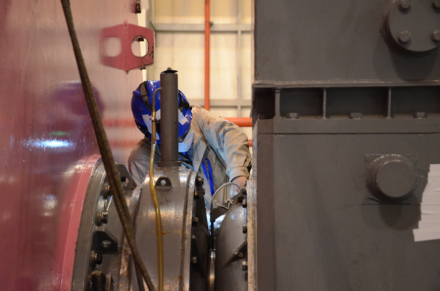 例如作為發(fā)電機(jī)大修相關(guān)項(xiàng)目的最后程序之一——發(fā)電機(jī)勵(lì)磁機(jī)側(cè)下端蓋回裝完成后,還需要檢修人員進(jìn)入到狹窄的發(fā)電機(jī)下部縫隙中進(jìn)一步檢查勘驗(yàn)。此時(shí)作為宣傳人員的我只能站在汽輪機(jī)平臺(tái)上“居高臨下”地去拍攝照片,最終成像出來的,就是一個(gè)佝僂著的脊背。