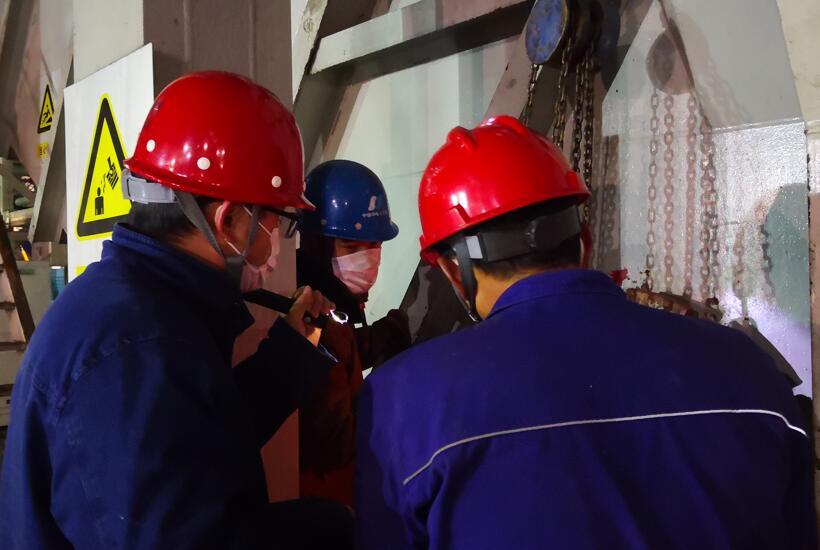 “目前來(lái)看,問(wèn)題只可能是撈渣機(jī)底板與導(dǎo)輪間隙有問(wèn)題或槽體內(nèi)刮板脫落,大家分頭重點(diǎn)排查這兩方面。”在大家茫然無(wú)措時(shí),生產(chǎn)副總經(jīng)理徐光學(xué)一語(yǔ)點(diǎn)醒夢(mèng)中人。鎖定“疑兇”,維護(hù)部副主任徐德剛迅速組織技術(shù)骨干研討。按照疫情防護(hù)需要,幾位專(zhuān)業(yè)行家距離一米以上,“吼”完了研討會(huì),并在較短時(shí)間內(nèi)擬定出三個(gè)處理方案,但所有方案的前提均是“確定底板情況!”
